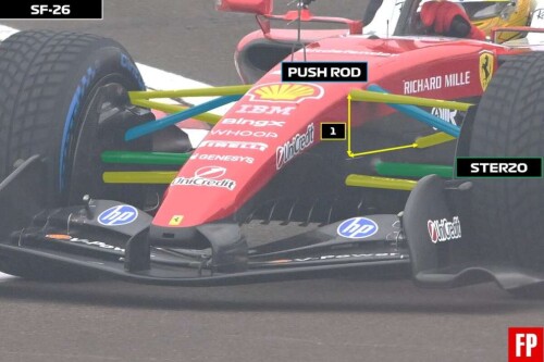 Одноместный автомобиль 2026 года, созданный под техническим руководством Андреа Де Зордо, оснащен новой подвеской «Феррари» (с толкателями как спереди, так и сзади). В 2025 году в «Хаас» предпочли оставить механику предыдущего года, чтобы не тратить время на согласования новой спецификации со Скудерией, уделив больше времени на разработку аэродинамики. Однако принять ту же стратегию в 2026 году было бы сложнее (если вообще возможно), поскольку нынешние машины имеют более узкую колею и работают на большей высоте над землей, чем предыдущие. Таким образом, ВФ-26 перенимает всю новую «агрессивную» подвеску «Феррари», что особенно заметно спереди. В частности, верхний треугольник сильно наклонен вниз (1), помогая направлять потоки, идущие от передней части в направлении нижней части кузова.
