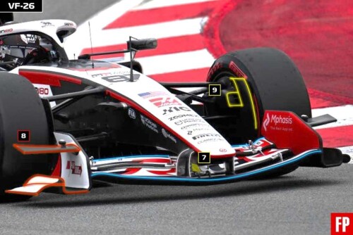 , с лопаткой в верхней части и ребром вдоль нижнего элемента, что помогает управлять турбулентностью от колеса. Наконец, в «Хаасе» решили сохранить вентиляционные отверстия тормозов за пределами конструкции защиты обода (9), там, где в «Феррари» и «Мерседесе» наоборот сузили входные каналы.